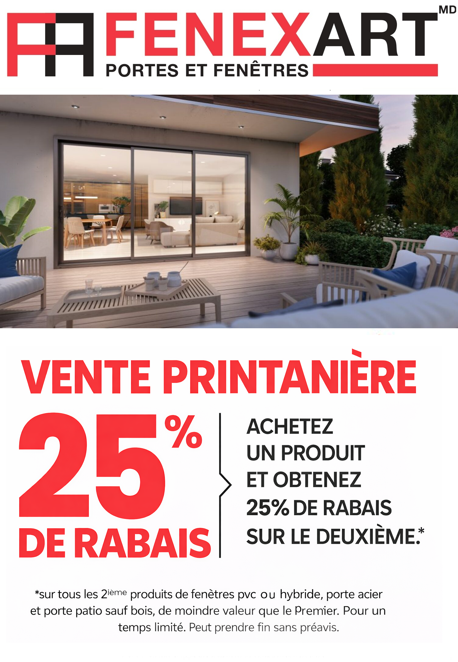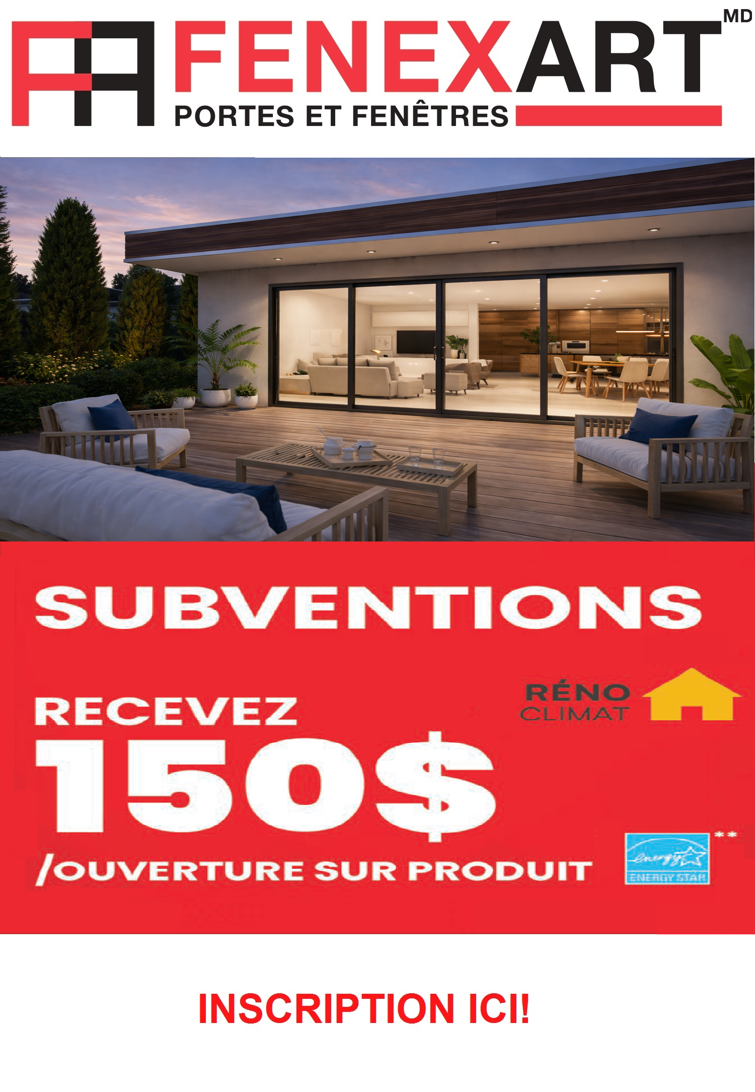 Grâce au programme-récompense FENEXART RECOMMANDÉ, chaque fois que vous nous référerez un nouveau client auquel nous aurons vendu, nous vous offrirons jusqu’à 100$* de remise en argent ! Sans aucune limite du nombre de clients référés…Pour les nouveaux clients référés, nous leur offrirons également jusqu’à 100$ en réduction applicable immédiatement sur leur projet de remplacement de fenestration. 50 $ de réduction pour les travaux de 1500 $ À 5000$ et 100$ pour les travaux de 5001$ et plus (montant avant taxes).